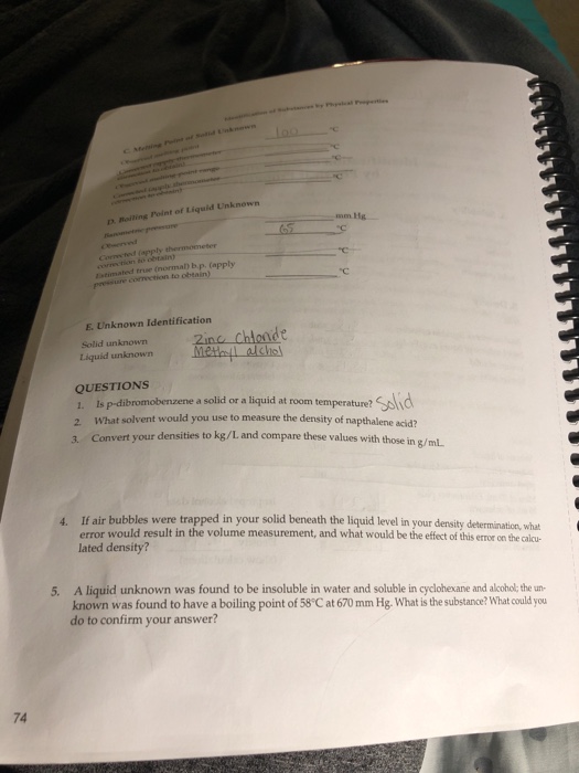 The unknown was found to have a boiling point of 58C at 670 mmHg. D 9091 gmL. A unknown liquid is insoluble in water and soluble in cyclohexane and alcohol with a boiling point of 57 C at 658 mm Hg.